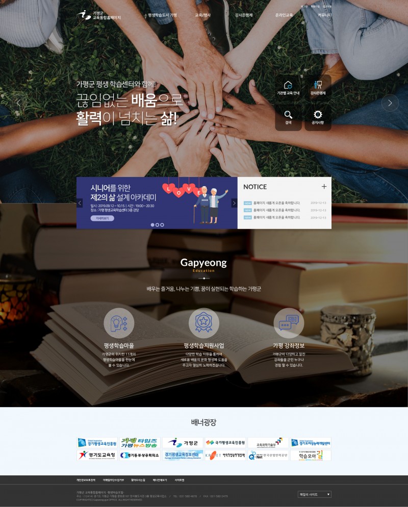공공 | 가평평생교육원 홈페이지 구축 페이지 정보 글쓴이 최고관리자 작성일2019-06-05 13:07 조회8,515회 댓글0건 이전글 다음글 목록 본문 가평 평생학습센터 홈페이지 재구축을 진행합니다. 이전글 다음글 목록