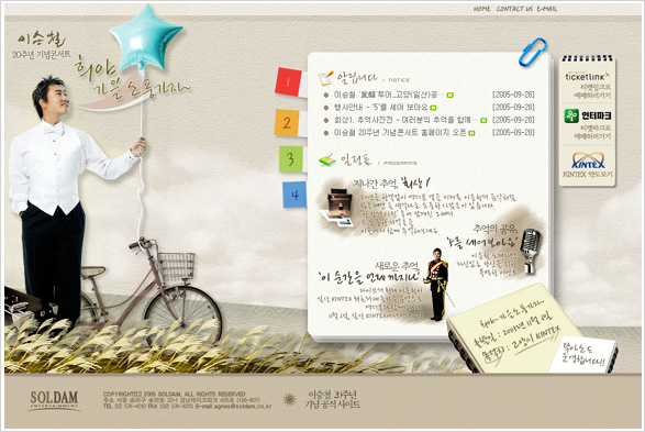 쿤스(대표 이민웅)은 공연기획 전문회사 솔담(주) 홈페이지를 구축의뢰를 받아 그 일환으로 이승철 20주년 기념 콘서트(희야 가을소풍가자) 사이트를 오픈했습니다.
